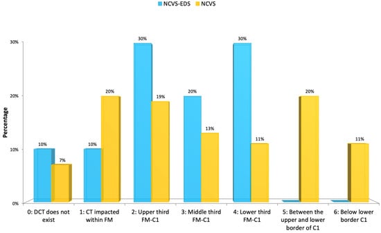 A recent study reported that Arnold–Chiari syndrome type I is a comorbid condition in hypermobile EDS and can be complicated by craniocervical instability or basilar impression [,]. While analysing the MRI of the patients with EDS and Arnold–Chiari syndrome type I, Milhorat found a greater formation of retro-odontoid pannus, compared to patients with Arnold–Chiari syndrome type I alone. In patients with EDS, the atlanto-axoid interval that defines instability remained constant when the parameter was incorporated. The parameters of the occipital–atlas–axis relationship were altered more than in patients with Arnold–Chiari syndrome type I. In another study, Eppelheimer detected a lower tonsillar position in patients with EDS and Arnold–Chiari syndrome type I, compared to patients with Arnold–Chiari syndrome type I without EDS, a result consistent with our current findings [].