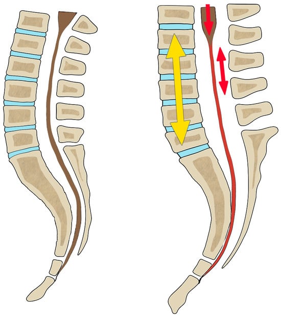 (Left): Lumbar spine and conus medullaris with normal filum terminale. (Right): Lumbar spine with EDS, with: increased elasticity and length of the lumbar spine (double yellow arrow); increased elasticity of the FT (double red arrow); resulting from the two previous ones on the conus medullaris (single red arrow), the FT remains elongated and inelastic (red).