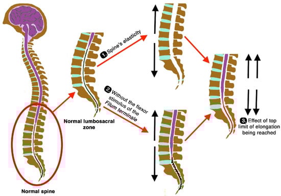 Second, in normal conditions, the filum terminale should have a flexing effect over the entire spine that contributes to the generation, together with gravity, of the physiological curves in the sagittal and coronal planes. However, these physiological curves disappear or are minimised when the filum terminale and the vertebral symphyses are loose, hence increasing the lengthening of the spine (Figure 20).