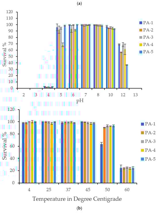 Phages maintained comparable viability and stability at pH levels ranging from 5 to 11. However, at pH 12, viability significantly decreased by 31–64%, and at pH 13, phages completely lost their stability and viability. The phages were also unstable in acidic conditions (pH 2, 3, and 4) but retained 68–98% viability at pH 5 (Figure 2).