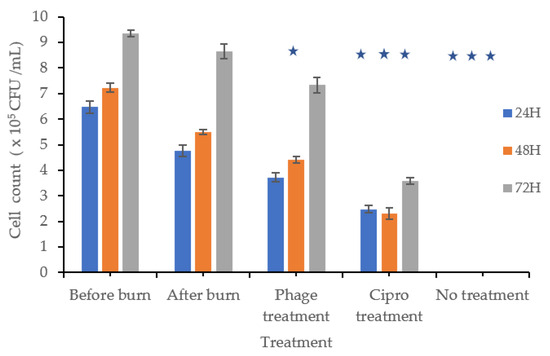 Burn Wound Infection: The bars labeled “Before Burn” represent L929 cell counts at 24, 48, and 72 h in unburned, uninfected cultures to monitor normal cell growth over time. The “After Burn” bars represent cell counts at the same time points after inducing a burn, but without bacterial infection, to evaluate the effect of burn injury on cell growth. Subsequently, burned L929 cells were infected with P. aeruginosa and treated with either a phage mixture, ciprofloxacin, or left untreated. Cell viability was measured at 24, 48, and 72 h post-treatment to assess cell proliferation. At 48 h, the phage-treated group showed significantly lower cell proliferation compared to the uninfected control (p ≤ 0.001), while cell counts partially recovered by 72 h, although they remained lower than the uninfected control. These findings indicate that phage treatment effectively controlled bacterial infection and supported partial recovery of L929 cells. Cultures treated with ciprofloxacin or left untreated showed significantly lower cell counts at all time points (p ≤ 0.001). Statistical analysis was performed using T-test. Statistical significance (p ≤ 0.001) is indicated in the graph with star (*).
