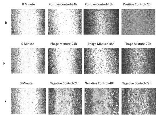 The phage cocktail consistently inhibited bacterial proliferation throughout the experiment, while enhancing cell viability, proliferation, and migration within the wound region. The positive control achieved complete wound closure after 48 h. After 24 and 48 h, phage treatment resulted in a statistically significant (p < 0.05) reduction in wound gap compared to positive control cultures. Cell proliferation and migration were observed in the phage-treated wounds by 72 h, leading to gap closure, although not to the extent seen in the positive control (Figure 5).