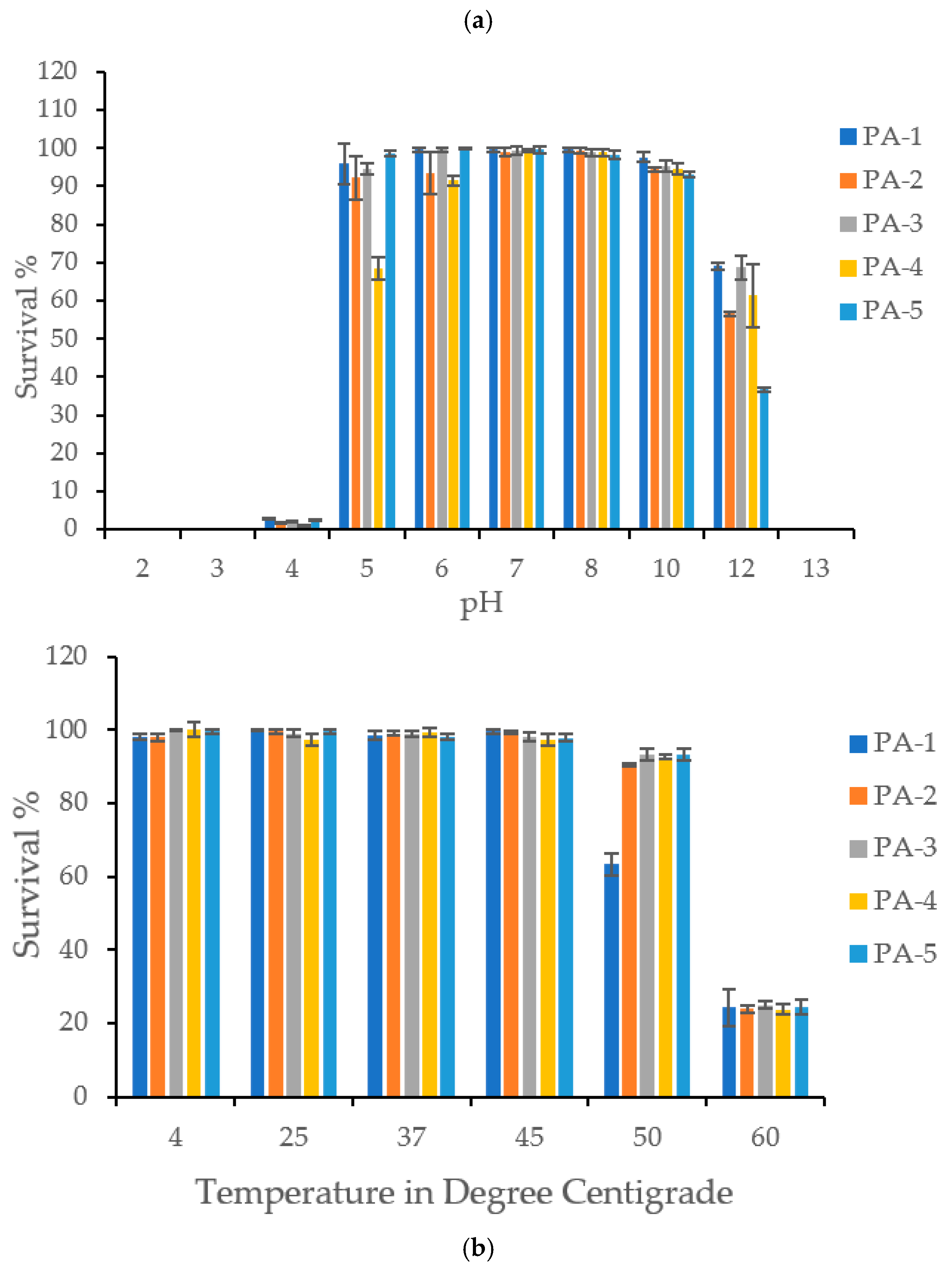 Phages maintained comparable viability and stability at pH levels ranging from 5 to 11. However, at pH 12, viability significantly decreased by 31–64%, and at pH 13, phages completely lost their stability and viability. The phages were also unstable in acidic conditions (pH 2, 3, and 4) but retained 68–98% viability at pH 5 (