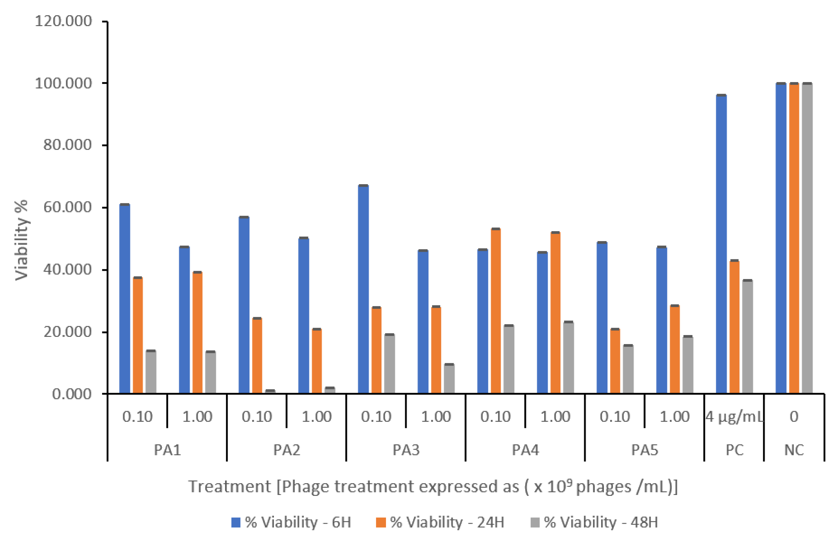 9 PFU/mL) were added for 6, 24, and 48 h. Both single-phage applications and a phage mixture (PA1–PA5) were tested. Biofilms treated with ciprofloxacin (2× MIC) served as positive controls, while untreated biofilms were negative controls. Biofilm inhibition was assessed via crystal violet staining, and optical density was measured at 590 nm. The percentage reduction of biomass was determined using the following formula: