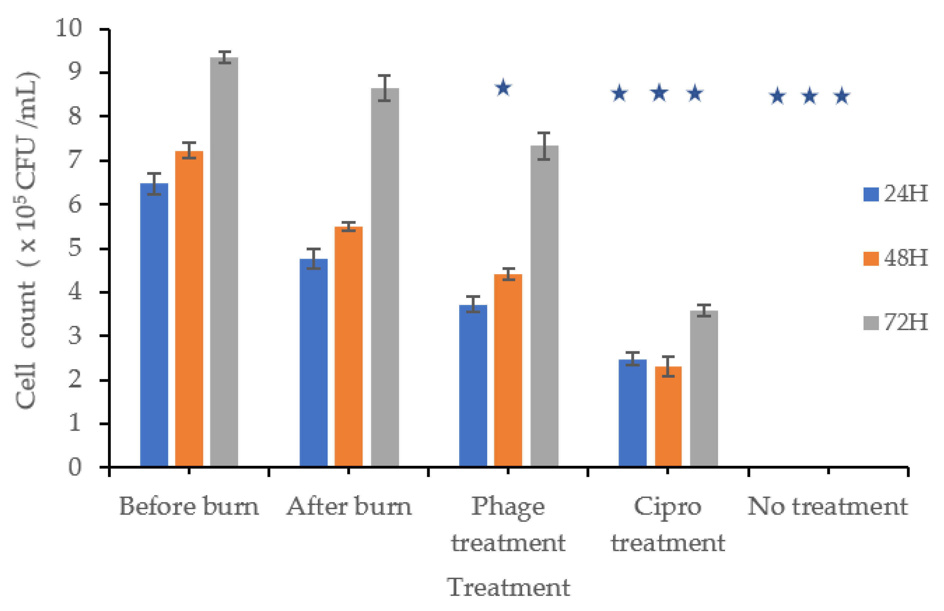 Cells were counted before and after burn injury, exposed to dry heat, and then treated with a phage mixture, a positive or negative control, or ciprofloxacin. In the positive control group, cell counts increased by 1.29, 1.49, and 2.34 times after 24, 48, and 72 h, respectively. In contrast, cells treated with the phage mixture multiplied by 1.01, 1.19, and 1.98 times over the same time periods (