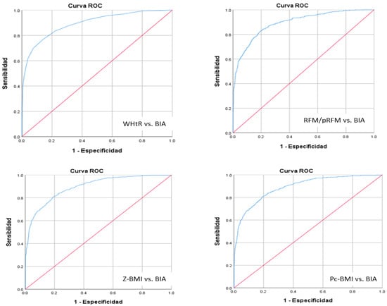 We found the highest Pearson’s correlation between BIA and RFM; thus, in the absence of BIA, RFM-pRFM could be used, principally in order to obtain a better approximation of fat mass percentage if physicians or nutritionists do not have DXA or BIA and they can complement the measurement with WHtR. The second highest Pearson’s correlation was for Z-BMI; therefore this is also a good method for diagnosis. However, when we used COR curves, we found very similar precision to the rest of the diagnostic methods, but we included children with overweight.