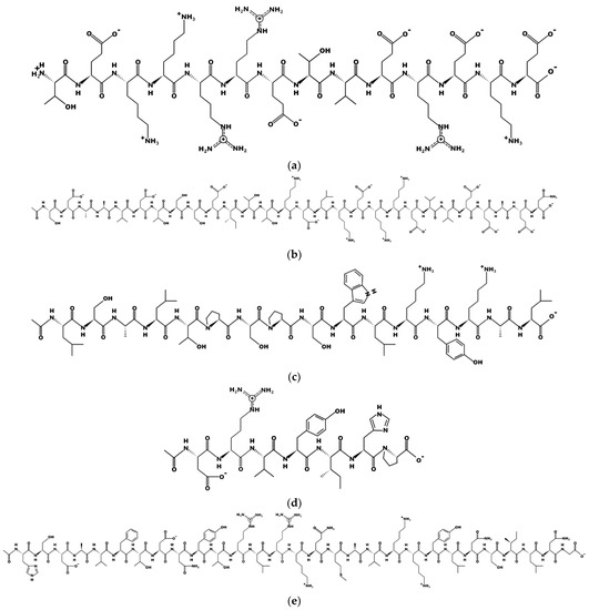 Schematic representation of selected peptides used in clinical trials. (a) Human ezrin peptide 324-337, HEP1; (b) thymosin-alpha; 1 (c) LSALT peptide; (d) angiotensin peptide (1-7); (e) vasoactive intestinal peptide (VIP) using the program PEPDRAW (http://pepdraw.com/) (accessed on 7 October 2021).