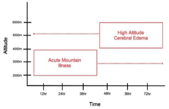Patients with HACE present with encephalopathy and declining neurologic function, such as altered mental status, slurred speech, cranial nerve palsies, papilledema, and ataxia [3,10]. It most often occurs following prolonged exposure to altitudes greater than 4000 m, although HACE at lower altitudes have been reported [3,6,10]. Acute mountain sickness (AMS) is another important form of HAI that is often found to precede HACE (Figure 1) [4,11]. It is characterized by non-specific symptoms, such as headache, confusion, dizziness, nausea, and vomiting, and presents at altitudes lower than those observed in HACE [3]. The symptoms of AMS peak around 24–48 h, around the time that HACE develops [1,11,12]. Due to disease time course and symptomatology, HACE is often proposed to be an end-stage presentation of AMS [4,6,11,13]. However, HACE can also present without preceding symptoms of AMS and has also been reported to present acutely within a matter of hours [1,14]. Thus, HACE may represent a distinct pathology unique from AMS and further study is warranted to clarify this matter.
