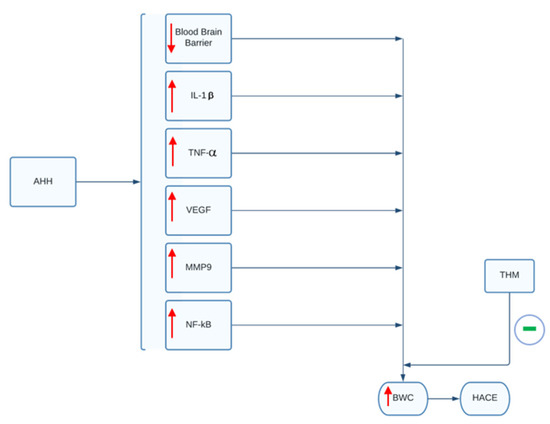 In a study by Pan and colleagues, the use of tetrahydrocurcumin (THM) in rodent models demonstrated the ability to prevent hypoxia-induced cerebral edema and inflammation [47]. THM is a powerful antioxidant derived from curcumin that is naturally found in the turmeric spice. In the study, the use of orally administered THM was shown to significantly reduce the rise in BWC (BWC: Equation (1)) following exposure to AHH, as well as prevent inflammation and blood–brain barrier damage caused by AHH (Figure 2) [47]. These effects were mediated through the inhibition of hypoxia-induced NF-κB/VEGF/MMP-9 inflammatory pathways. Based on the study, the prophylactic administration of 40 mg/kg for 3 days prior to the exposure to acute hypobaric hypoxia was able to diminish significantly the rise of BWC, interleukin-1β and tumor necrosis factors-α levels in rodents post-AHH exposure [47]. The use of THM can therefore serve as a promising therapeutic agent to treat HACE in human subjects. However, THM has poor bioavailability and would require greater than 200 mg per day orally to show similar effects as those seen in rodents. Thus, according to the authors, this quantity would likely compromise patient compliance and bioavailability must be addressed before clinical use [47].