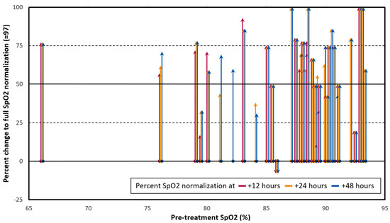 For the 34-patient severe COVID-19 patients of this study, a measure of percent normalization toward a fully optimal SpO2 value of 97 was applied, which for pre- and post-treatment SpO2 values S0 and S1, was: 100 × (S1−S0)/(97−S0), capped at 100%. Pre- and post-treatment SpO2 values are plotted for all 34 patients using this percent normalization measure in Figure 1 and are also presented directly in Figure 2 and Figure 3 and Table S1.