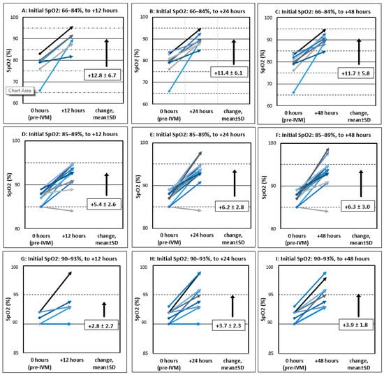 Figure 2 shows all pre- and post-treatment SpO2 values grouped into nine graphs (A–I) by the range of pre-treatment SpO2 values and post-treatment times (after first IVM dose) of +12, +24, and +48 h. As shown in Figure 2 and identically in Table 2, those patients with the lowest, mid-range, and highest pre-treatment SpO2 values had mean SpO2 increases at +12 h of 12.8, 5.4, and 2.8, respectively (all SpO2 values in percentage units). Figure 3 shows all pre- and post-treatment SpO2 values throughout the entire observation period for each of the 34 patients. Note that these values were recorded less frequently after a patient’s SpO2 value had increased above severe COVID-19 levels (≤93) and general condition had improved.
