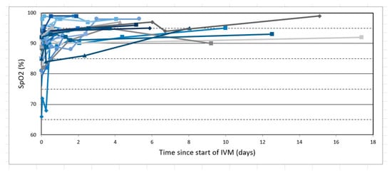 Figure 4 shows successive SpO2 values for one patient who had a particularly rapid increase in these values after his first dose of IVM. This patient was a 25-year-old male, treated by a CPCPZ physician at a GP clinic without a supplemental oxygen capability. He received his first 12 mg IVM dose (repeated over the next four days) immediately after entering the clinic with respiratory distress and bilateral pneumonia indicated by stethoscopic examination. His COVID-19 diagnosis was confirmed by a positive result from a rapid antigen test. As shown, his SpO2 values increased from that recorded immediately before treatment (79%) to values at 45 min (87%), 90 min (92%), and 3 h (95%) post-treatment. He was discharged later that same day, and his home SpO2 readings then fluctuated between 92% and 95% over the next three days. By the fourth day after discharge, his SpO2 stabilized at 97%, his pulse dropped to 77 from prior values over 100, and he resumed working from home. Several other patients in this series likewise experienced some degree of tachycardia; however, these were generally manifested prior to the administration of IVM and did not become more pronounced after IVM dosing. While the increases in SpO2 for most of these 34 patients occurred less rapidly, over 48 h, than for this case, as shown in Figure 1, Figure 2 and Figure 3 and Table S1, several other patients had SpO2 increases of 12% or more within 12 h after the first IVM dose (Table S1): SpO2 76% to 88% for a 38-year-old female; 83% to 96% for a 45-year-old male; 66% to 90% for a 49-year-old female; and 80% to 92% for a 75-year-old male.