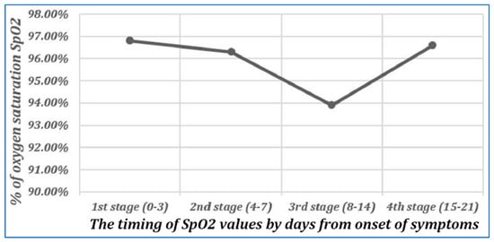 Changes in oxygen saturation during different stages of follow-up of cases with COVID-19 infection. Reproduced from Osman et al., 2020 [31] (CC-BY 4.0). These values were obtained from 125 PCR-confirmed COVID-19 inpatients, March-August 2020, with all values obtained on room air except for 3 patients in Stages 1 and 2, 13 in Stage 3, and 1 in Stage 4. As shown, the mean value of SPO2 decreases from Days 0–3 to Days 8–14; it is inversely correlated with the severity of pulmonary CT abnormalities in these patients throughout the full period of observation.