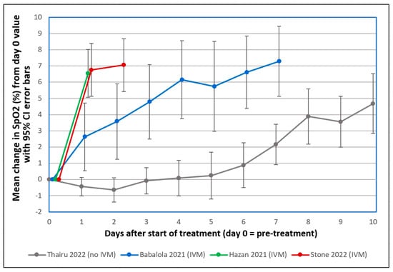- Babalola, O.E.; (Bingham University, New Karu, Nigeria). Personal communication, 2022. This communication provided deidentified patient level data for SpO2 changes post-treatment from two studies which he coauthored (per references [38] and [39] as cited above), one using standard treatment excluding IVM (#38) and the other including IVM in the treatment regimen (#39), for those values obtained exclusively on room air and with pre-treatment SpO2 values ≤ 93%.