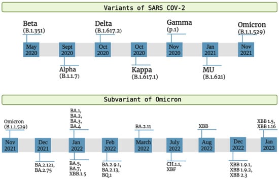 The prime reason behind increased concerns of a deadlier wave of pandemic following the emergence of the Omicron variant was the presence of a substantial number of mutations in the spike protein [12]. The Omicron variant exhibited increased transmissibility and higher odds of reinfection even in the fully vaccinated population and in those who were previously infected by other variants [13]. However, identical to the previous VOCs, the Omicron variant relies on angiotensin-converting enzyme 2 (ACE2) receptors for entry into the host cells [14]. Omicron exhibited a combination of all the concerning mutations from the previous VOCs with several exclusive mutations in the spike, as well as non-spike proteins [15]. The non-spike proteins harboring mutations in the Omicron variant include viral envelope proteins, membrane proteins, nucleocapsid proteins, nonstructural proteins, and the furin cleavage site [16]. The Omicron variant has almost 60 mutations in total, from which 50 are amino-acid-altering mutations and the other 10 are non-amino-acid mutations. The spike protein of the Omicron variant includes 32 mutations, and 15 of them are localized in the receptor-binding domain (RBD) [17]. The previous VOC Delta (B.1.617.2) had barely two mutations in the RBD. RBD is present on the spike protein and plays a critical role in the binding of SARS-CoV-2 with the host cells, initiating the entry of the virus and subsequent replication processes. Moreover, it is a primary target for neutralizing antibodies (Nabs), as well as vaccines against SARS-CoV-2 [18]. Hence, these mutations have rendered the Omicron variant resistant to the virus targeting monoclonal antibodies, as well as the vaccines. The mutations in the spike protein improve the affinity of the virus to the ACE-2 receptor, increasing transmissibility [19]. P681H, N679K, and H655Y mutations are present in the furin cleavage site, which impacts the entry of the virus into cells and increases the transmissibility of the virus [20]. Additionally, viral transmissibility and infectivity of Omicron are also improved by the N501Y, D6146, N440K, and T478K mutations [21]. The nucleocapsid protein of the Omicron includes R203K and G204R mutations [22]. The amino terminal domain (NTD) has T95I and G142D mutations, which prolong the infection and aid in the escape from NTD-targeted antibodies [23]. To strengthen these claims, Planas et al. conducted an in vitro study on the serum of patients infected with the Omicron variant and reported that Omicron was not neutralized by sera collected from COVID-19 patients after more than 6 months of recovery [24]. These characteristics of the Omicron led to the rapid transmission of the virus into many countries despite successful mass vaccinations and immunization from infections with previous variants [25]. Hence, this led to concerns over the reliability of the acquired immunity of the population from previous infections against the Omicron. The evolution of the SARS-CoV-2 did not cease after the appearance of the Omicron variant. Numerous sublineages of Omicron have emerged, namely BA.1/B.1.1.529.1 (the initial Omicron variant), BA.1.1, and BA.2/B.1.1.529.2, BA.3/BA.1.1.529.3, BA.4, BA.5, BA.2.12.1, and BA.2.11 [26]. All of these sublineages vary in their viral mutations, clinical presentation, and pathological characteristics. Out of the listed subvariants, BA.1, BA.1.1, and BA.2 are found to be the most encountered in circulation [27]. The BA.1/B.1.1.529.1 is the original form of the Omicron variant and is usually determined by the presence of S-gene target failure (SGTF) [28]. BA.1.1 is a subvariant of BA.1 exhibiting R346K mutation in the spike protein [14]. The BA.2 lineage has 8 unique alterations, which are not present in other subvariants, and lacks 13 mutations found in the BA.1. BA.2 has shown a higher binding affinity for ACE-2, providing it with a selection advantage over other variants [29]. Following its emergence, BA.2 rapidly became prevalent in countries including India, Denmark, Singapore, and Norway [30]. The BA.4 and BA.5 variants were first detected in South Africa in January and February of 2022 and resulted in a fifth wave of SARS-CoV-2, accounting for nearly 50% of reported cases in South Africa [31]. BA.4/5 has additional R493Q, Del69-70, F486V, and L452R mutations on the spike protein compared with BA.1. The BA.4/5 variants are found to have higher transmissibility than the other Omicron sublineages and higher odds of reinfection [32]. The capability of BA.4/5 to evade the neutralizing antibodies produced by the BA.1 infection is a potential reason behind these observations. Furthermore, compared with BA.2, BA.4/5 is 4.2-fold resistant to the sera obtained from vaccinated and boosted individuals [33]. Various variants and subvariants of SARS-CoV-2 with their time of first occurrence are graphically represented in Figure 1.