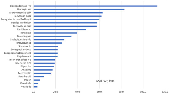 It is noteworthy that the European Medicines Agency (EMA) lists peptides as proteins, unlike the US Food and Drug Administration (FDA) [3]. The E. coli-expressed products, including hormones, cytokines, enzymes, antibody fragments, and shorter-than-full-length antibodies, came into clinical use long before the use of Chinese Hamster Ovary (CHO) cells (Table 1). Some proteins still extracted from tissues can also be manufactured using E. coli. Examples include Alpha-1 antitrypsin, Antithrombin III, Botulinum toxin, C1 inhibitor, Fibrinogen, Heparin, Hirudin, Snake venom proteins, Streptokinase, Thrombin, and Urokinase. Figure 1 shows that most proteins expressed in E. coli are of lower molecular weight since most of the more complex and higher molecular weight monoclonal antibodies (mAbs) are expressed in CHO cells.