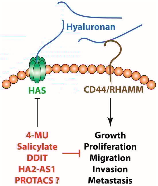 Hyaluronan synthesis inhibition with small molecules like 4-MU, salicylate and DDIT, genetic manipulation through HAS2-AS1, as well as PROTACs might be of therapeutic value for the treatment of cancer by inhibiting tumour growth, proliferation, invasion and metastasis.