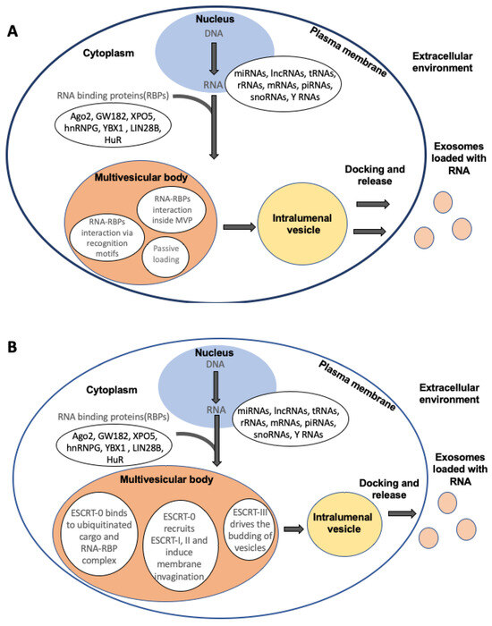 Schematic of RNA packaging inside extracellular vesicles. (A) RNA and RNA-binding proteins (RBPs) interact in the cytoplasm, where RBPs bind to RNA via specific sequence recognition motifs or secondary structures. The RNA-RBP complex then interacts with certain proteins in the multivesicular body (MVB). In cases of higher abundance of RNA in the cytosol, there might be passive diffusion of RNA moieties inside the extracellular vesicles: (B) RNA-RBP complexes bind to ESCRT-0 inside the MVB, which recruits ESCRT-1 and -II, initiating membrane invaginations. Subsequently, ESCRT-III drives the budding of the vesicles inside the MVB. Cargo is transported from the MVB to intraluminal vesicles and then released from the cell via exocytosis.
