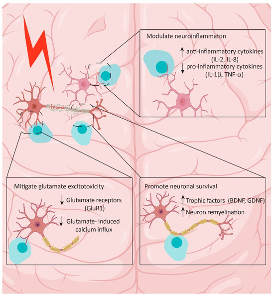 MSCs, a type of multipotent stem cells that can be harvested from autologous bone marrow, adipose tissue, or umbilical cord, possess the capacity to migrate to the injury site and differentiate into neural-like cells expressing neuronal markers such as the neuronal nuclear antigen (NeuN) and the microtubule-associated protein 2 (MAP2) [58,62]. In the context of TBI, these cells have demonstrated efficacy in promoting neuronal regeneration and modulating the immune environment [62], thereby improving both structural and behavioral outcomes [58]. They have been also demonstrated to mitigate the injury-induced excitotoxicity by downregulating the membrane expression of glutamate receptors [63] and modulating their downstream signaling [64]. Alternatively, NSCs and OPCs are tripotent cells capable of differentiating into neurons, astrocytes, and predominantly oligodendrocytes in the case of OPCs. Extensive preclinical evidence illustrates the efficacy of these cell types in homing in on the injured site [65] and facilitating neurological recovery through various mechanisms including trophic factor secretion (BDNF, GDNF), injured axon remyelination, neural circuit remodeling, and extracellular matrix scaffold deposition [36]. In fact, a meta-analysis of 31 published studies demonstrated that the stem cell secretome, including secreted molecules and extracellular vesicles, significantly improves the neurological function and inflammation in rodent models of TBI [66]. Identifying the crucial factors secreted by stem cells and involved in neuroprotection could hence be leveraged for a cell-free therapeutic approach. Additionally, while OECs are not stem cells per se, we discuss them here as they are specialized olfactory glial cells crucial for olfactory nerve regeneration. In fact, the olfactory nerve is unique in its ability to regenerate, and primary sensory olfactory neurons are constantly replaced throughout life, unlike other peripheral nerves [67]. OECs exhibit marked regenerative properties illustrated by a rapid migration to injury sites, the phagocytosis of debris, and the promotion of axon recovery through the secretion of growth factors, as axon guidance cues. The distinctive properties of OECs arise from their phagocytic abilities combined with their low production of pro-inflammatory cytokines [67]. Notably, while OEC transplantation has shown to be safe in several clinical trials [68] and has garnered attention in the context of spinal cord injury, its application for TBI treatment remains limited to a few studies [69,70].
