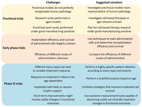 First, age is likely to play a limiting effect both for endogenous and exogenous cell-based therapies. Aging is characterized by a chronic, low-grade inflammatory state often referred to as “inflammaging” [79]. The aged brain presents a unique microenvironment that has a lower reserve of endogenous stem cells and is less favorable for stem cell proliferation and maturation than young brains [80]. It is therefore likely that older populations will respond differently to cell-based therapies compared to younger patients. Unfortunately, few preclinical studies have been specifically tailored to aged populations, which represents an understudied and clinically relevant area for further research. Basic science and translational studies of TBI in older subjects would potentially elucidate additional mechanisms underpinning age-related disparities in TBI outcomes and reveal avenues for therapeutic interventions targeting unique pathophysiologic changes within older individuals. This can be extended to the clinical realm, where clinical trial design would benefit from a stratification of the patient population based on age. This practice might uncover benefits in a subset of patients, and is supported by preliminary evidence in early-phase trials [71].