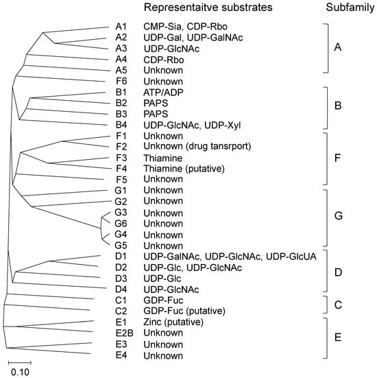 The majority of this family of proteins are involved in the transport of nucleotide sugars, which serve as essential substrates for glycosylation reactions in the endoplasmic reticulum (ER) and Golgi apparatus. In addition, the SLC35 family includes an adenosine triphosphate (ATP) transporter (SLC35B1), 3′-phosphoadenosine 5′-phosphosulfate (PAPS) transporters (SLC35B2 and SLC35B3), and a thiamine transporter (SLC35F3), in addition to transporters with unknown function (i.e., orphan transporters). To date, seven subfamilies (A to G) and 32 members (including pseudogene E2A) have been classified into this large SLC35 family (Figure 1 and Table 1). Among them, the functions of the A-D subfamily members have been well characterized, whereas little knowledge has been obtained regarding the functions of the members in the E-G subfamilies. The majority of NSTs are multiple transmembrane proteins localized in the ER or Golgi apparatus and contribute to the delivery of substrates for glycosylation [3].