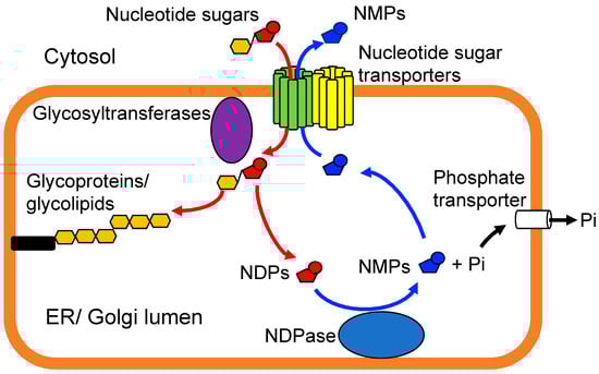 A schematic illustration of the function of typical nucleotide-sugar transporters (NSTs). NSTs translocate specific nucleotide sugars from the cytosol into the endoplasmic reticulum (ER) or Golgi lumens using an antiport mechanism. Glycosyltransferases transfer a sugar residue from corresponding donor substrate to a specific hydroxyl group of its acceptor molecules. Nucleoside diphosphatase (NDPase) catalyzes the hydrolysis of nucleoside diphosphate (NDP) to yield nucleoside monophosphate (NMP) and inorganic phosphate (Pi). NSTs utilize MNPs as their antiport molecules. NSTs form homodimers or heterodimers with themselves or other NSTs and interact with specific glycosyltransferases. It should be noted that in the case of certain NSTs, alternative antiport mechanisms have been proposed, including UDP-sugar/UDP-sugar countertransport.