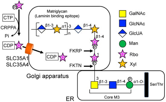 In 2021, Ury et al. reported that the SLC35A1 can transport CDP-Rbo, a nucleotide-pentose alcohol, as well as CMP-Sia [19]. It is known that the functional O-mannosyl glycan on α-dystroglycan contains a tandem repeat of Rbo 5-phosphate, which is required to prime the addition of a repeated disaccharide (-Xyl-α1,3-GlcUA-β1,3-)n, called matriglycan, to the glycan chain [38] (Figure 3). This unique glycan structure of α-dystroglycan is of paramount importance in the interaction with extracellular matrix proteins, such as laminin. CDP-Rbo is synthesized by an enzyme called CDP-L-ribitol pyrophosphorylase A (CRPPA; also known as isoprenoid synthase domain-containing protein, ISPD) in the cytosol. Subsequently, enzymes FUKUTIN (FKTN) and FUKUTIN-related protein (FKRP) transfer Rbo 5-phosphate to the core M3 structure (GalNAc-β1-3-GlcNAc-β1-4-Man) on the α-dystroglycan in the Golgi apparatus [39,40] (Figure 3). The defects in CRPPA [41,42], FKTN [43], and FKRP [44,45] have been associated with muscular dystrophy due to defective glycosylation of α-dystroglycan. Although the translocation of CMP-Rbo from the cytosol into the Golgi apparatus is an essential process for the Rbo 5-phosphate modification, patients with SLC35A1-CDG did not exhibit symptoms of α-dystroglycanopathy. Another CDP-ribitol transporter, SLC35A4, is proposed to be involved in the transport of CDP-ribitol into the Golgi apparatus in a redundant manner [19].