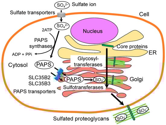 It is well known that the sulfated state of GAGs is a key factor in determining the function of PGs [117]. PAPS synthesis and transport are essential for the sulfation process. The initial step involves the transport of sulfate ions into the cell by sulfate transporters. This is followed by the conversion of the sulfate ion to an activated sulfate donor, PAPS, by PAPS synthases. The subsequent step involves the translocation of PAPS from the cytosol into the Golgi apparatus by PAPS transporters. Finally, sulfotransferases transfer sulfate from PAPS to GAGs (Figure 4). In humans, it is known that anomalies in the PAPS synthesis cause a range of dysplasias. SLC26A2 (DTDST) is a plasma-membrane sulfate transporter that is responsible for four different osteochondrodysplasias: diastrophic dysplasia (DTD) [118], achondrogenesis type IB [119], atelosteogenesis type II [120], and multiple epiphyseal dysplasia (MED) [121]. DTD is a disease that is characterized by clinical features of dysplasia, including dwarfism, spinal deformation, and abnormalities of the joints [118]. In addition, it has been demonstrated that mutations in the human PAPS synthase 2 (PAPSS2) gene are associated with a specific form of spondyloepimetaphyseal dysplasia (SEMD) [122]. In a study using zebrafish, Wiweger et al. reported that the mutation of SLC35B2 ortholog pinscher (pic) resulted in defective sulfation of GAGs and other molecules and was potentially involved in skeletal dysplasia [123,124]. The homozygote pic mutant displayed a complete absence of sulfation of proteoglycans in the ECM and other sulfated molecules. Furthermore, the mutant displayed dwarfism and severe cartilage and bone defects that closely resembled those observed in human skeletal dysplasia, as well as pronounced ultrastructural abnormalities [123].