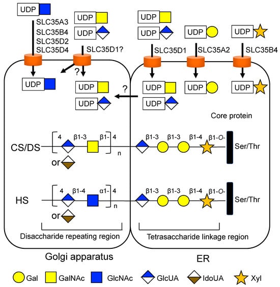 - Hiraoka, S.; Furuichi, T.; Nishimura, G.; Shibata, S.; Yanagishita, M.; Rimoin, D.L.; Superti-Furga, A.; Nikkels, P.G.; Ogawa, M.; Katsuyama, K.; et al. Nucleotide-sugar transporter SLC35D1 is critical to chondroitin sulfate synthesis in cartilage and skeletal development in mouse and human. Nat. Med. 2007, 13, 1363–1367. [Google Scholar] [CrossRef] [PubMed]