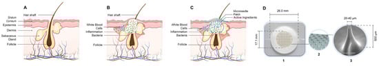 What is more, the integration of anti-acne actives into an advanced delivery system could further enhance the efficacy and precision of treatment by ensuring targeted delivery to the affected areas, improving bioavailability, and minimizing potential side effects. In recent decades, microneedle patch technology has emerged as a promising platform for the transdermal delivery of therapeutics and cosmeceuticals. This innovative approach has garnered significant attention for its potential in a wide range of applications, including the administration of vaccines, pharmaceutical agents, and bioactive molecules targeting dermatological conditions [11]. Microneedle patches are composed of arrays of microscale needles, typically measuring between 50 and 900 μm in length, designed to penetrate the stratum corneum—the outermost barrier of the skin—without reaching the underlying nerve-rich or vascularized layers. This minimally invasive penetration facilitates the enhanced transdermal transport of active compounds, overcoming the inherent limitations posed by the skin’s barrier function. Among the various types of microneedle systems, dissolvable microneedle patches (fabricated from water-soluble and biodegradable polymers) have gained particular interest due to their ability to deliver encapsulated agents directly into the skin in a controlled and biocompatible manner [11,12]. Thus, dissolvable microneedle patches (DMP) with dermo-cosmetics offers targeted and efficient managements of acne, addressing acne pathogenesis while enhancing patient convenience and compliance. Such integration may optimize the therapeutic outcomes by increasing the stability and sustained release of active ingredients, thereby providing more consistent and long-term benefits in acne management. DMP are submillimeter-sized polymeric needles (50–900 μm long) arrayed on a patch, which bypasses the stratum corneum (SC), and enables the delivery of dermo-cosmetics including peptides and proteins into the epidermis in a minimally invasive manner [11] (Figure 1C). Hyaluronic acid-based dissolving microneedles (HA-DMP) has attracted substantial attention in the last decade not only for drugs delivery means but also for cosmetic applications including anti-wrinkle and anti-hyperpigmentation applications. Microneedles have been described as an appealing and promising transdermal drug delivery way due to the assets of safety, painlessness, minimally invasive and high delivery efficiency [13,14]. Furthermore, excellent biocompatibility with all types of skins and its viscoelastic properties for mass manufacturing have presented great opportunities. Due to the complexity of the acne vulgaris, the importance of patient adherence to the treatment regimen and required patients’ satisfaction, DMP with anti-acne dermo-cosmetics could present an attractive option for acne management. In this context, we have evaluated derma-cosmetics with DMP delivery system for evaluation of acne management. In this study, a mixture of ingredients including peptides, antioxidants, and extracts with known anti-acne properties are applied to subjects with common acne using HA-MNP. The assessment of the potentially synergistic mixture for its success on the acne-prone skin including sebum production, redness, and inflammatory signs (response) was studied to gather new data using human subjects over a course of four weeks by a monocentric clinical study. This study aimed to explore the evidence supporting the use of microneedle patches (MNP) in combination with selected dermo-cosmetic formulations for acne management, with a particular focus on their effects on sebum production, redness, and inflammatory signs.