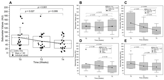 Skin sebum analysis over time. Skin sebum level was assessed at baseline (T0), two weeks (T2), and four weeks (T4) post-treatment. (A) Overall sebum analysis comparison across all subjects is shown with the mean lines (---). Subgroup analyses are also presented for (B) Adolescent, (C) Adult, (D) Male, and (E) Female subjects. (AU: Arbitrary Units).
