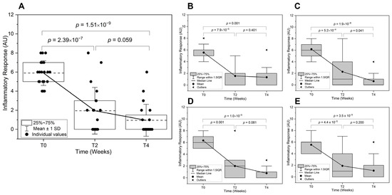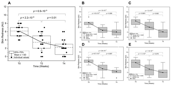 The study demonstrated a significant reduction in inflammatory signs across all subject groups following the treatment, with notable differences in response patterns based on age and gender. The overall improvements in the inflammatory signs in the test area after two and four weeks of application were by 68.8% and 83.3%, respectively. A significant reduction was observed from T0 to T2 (p = 2.39 × 10−7) and from T0 to T4 (p = 1.51 × 10−9) (Figure 4A).