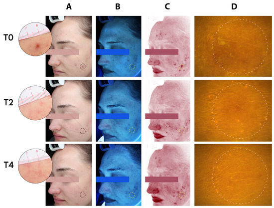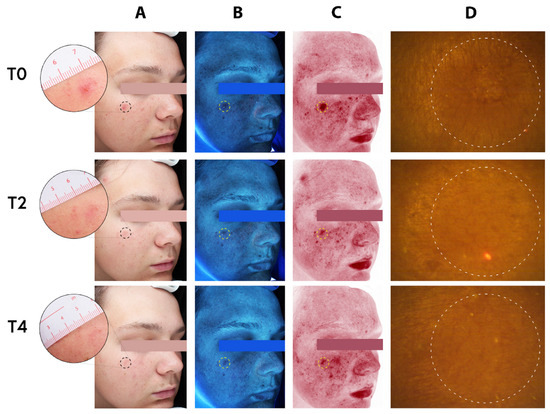 Complexion analysis of a 17-year-old adolescent male. (A) Standard clinical photography (B) erythema-directed digital images, (C) excitation images, and (D) fluorescence images of porphyrin measurements, at baseline (T0), two weeks (T2), and four weeks (T4) of treatment with the MNs acne patches on selected spots (dotted circles). Assessment of inflammatory lesions and followed by period of two and four weeks of treatment (T2 and T4) with the test patches showing visible improvement of both inflammatory and non-inflammatory lesions.