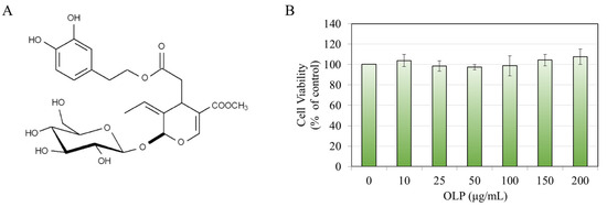 (A) Chemical structure of oleuropein (OLP). (B) B16F10 cell viability after a 48 h treatment with OLP (0–200 µg/mL). Data are mean ± SD of at least three independent experiments.