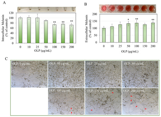 (A) Relative cellular melanin content and (B) extracellular melanin content in B16F10 cells after a 48 h treatment with OLP (0–200 µg/mL); the corresponding photos of cell pellets and culture medium are shown above respective plots; (C) microscopic images of B16F10 cells subjected to various OLP concentrations showing the formation of elongated dendrites (red arrows in images) for higher concentrations; data for (A) are mean ± SD of triplicates (n = 3) from one representative experiment of two separate experiments, while data for (B) are mean ± SD of values from two independent experiments (n = 5); * p < 0.05, ** p < 0.01.