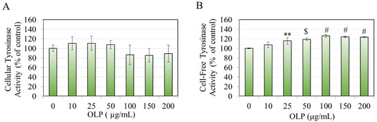 The results of the effect of OLP on tyrosinase enzyme activity showed that OLP did not affect cellular tyrosinase activity significantly at any concentration (Figure 3A) but increased cell-free tyrosinase activity for the concentration range 25–200 µg/mL; significant increases of 15.71%, 19.19%, 26.24%, 24.34%, and 23.67% were obtained at concentrations of 25, 50, 100, 150, and 200 µg/mL, respectively (Figure 3B). This result confirms that OLP has a direct stimulatory effect on the activity of tyrosinase enzyme.