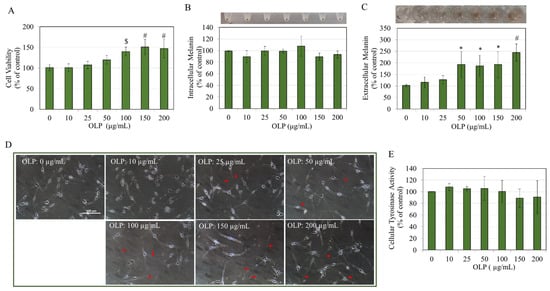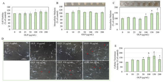 (A) HEMn-MP cell viability after a 48 h treatment with OLP (0–200 µg/mL). (B) Relative intracellular melanin and (C) extracellular melanin contents in HEMn-MP cells after treatment with OLP (0–200 µg/mL) with the corresponding photos shown above the respective plots; (D) phase-contrast images of HEMn-MP cells treated with OLP (0–200 µg/mL); the extended dendrites are shown by red arrows; (E) tyrosinase activity of HEMn-MP cells after OLP treatment; data for (B,E) are mean ± SD of three independent experiments (n = 3), while data for (A,E) are mean ± SD of values from two independent experiments (n = 5); * p < 0.05, $ p < 0.001, and # p < 0.0001.