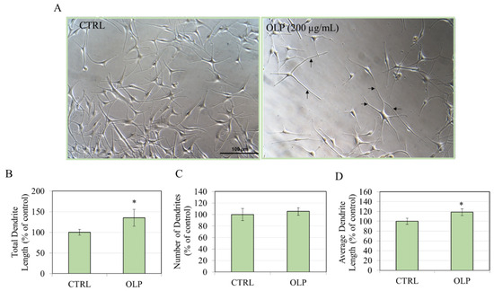 (A) Micrographs of HEMn-LP cells before and after a 48 h treatment with 200 µg/mL OLP; black arrows denote extended dendrites. Quantitation of dendritic parameters: (B) total dendrite length; (C) dendrite number; and (D) average dendrite length; * p < 0.05.
