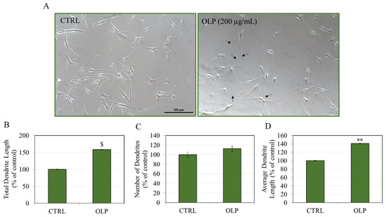 (A) Micrographs of HEMn-MP cells before and after a 48 h treatment with 200 µg/mL OLP; black arrows denote extended dendrites. Quantitation of (B) total dendrite length; (C) dendrite number; and (D) average dendrite length; ** p < 0.01 and $ p < 0.001.