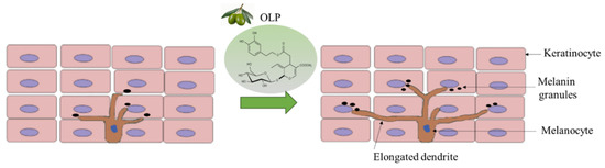 Our research has demonstrated that OLP uniquely stimulates dendrite length, which partially accounts for the observed increase in melanin export in MP and LP cultures. A scheme illustrating this is shown in Figure 8. Substances that trigger toxicity in primary melanocytes may also lead to an elevation in extracellular melanin; however, OLP exhibited no cytotoxic effects at the concentrations that prompted an increase in extracellular melanin. This discovery reveals that OLP enhances the transport of melanin through the elongation of dendrites while leaving the intracellular melanin levels unchanged. Furthermore, our results of the stimulation of melanosome export by OLP in LP cells are an added advantage since fair skin is typically known to exhibit a reduced capacity to tan based on the Fitzpatrick skin type classification (skin types I and II) [58]. EPI64 is a GTPase-activating protein that inactivates Rab27A. Rab27A is a protein found on mature melanosomes that regulates the actin-based transport of melanosomes [59,60]. Slp-2a is a Rab27A-binding protein that participates in cell elongation via its interaction with the plasma membrane and melanosomes [61]. The vacuolar protein sorting 9-ankyrin-repeat protein (VARP) is essential for dendritic elongation and the promotion of enzyme trafficking in melanogenesis [62,63]. A previous study [17] indicated that the extracellular melanin-enhancing and dendricity-stimulating activities of methyl quercetin derivatives were facilitated via the inhibition of the EPI64 protein. Another compound, kaempferol, was shown to enhance dendritic lengths in B16F10 cells, with the authors noting that it facilitated the actin-based movement of melanosomes by increasing the expression of Rab27A, RhoA, and Cdc42 proteins in B16F10 cells [15]. Olive leaf extract at 100 µg/mL and 1000 µg/mL concentrations increased the rate of actin polymerization in renal cells, therefore modifying cytoskeletal remodeling [64]. We propose that the process by which OLP enhances the elongation of cell dendrite lengths may be attributed to an increased expression or activation of proteins such as Slac-2a, VARP, Rab27A, RhoA, or Cdc42, or alternatively, to the downregulation of EPI64 expression. Additional investigation is required to clarify these hypotheses.