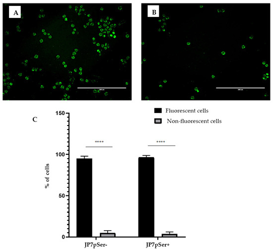 JP7pSer- (A) and JP7pSer+ (B) cells observed under a microscope at 200× magnification. The majority of the cells under 490 nm excitation emit the green fluorescence of the GFP protein. Scale 200 µm. (C) Graphical representation of the percentages of fluorescent and non-fluorescent cells in the two cell lines JP7pSer- and JP7pSer+ treated by ImageJ. Data are expressed as mean ± standard deviation of at least three independent experiments, and significant differences between the different groups in each cell line are indicated by **** p-value < 0.0001.