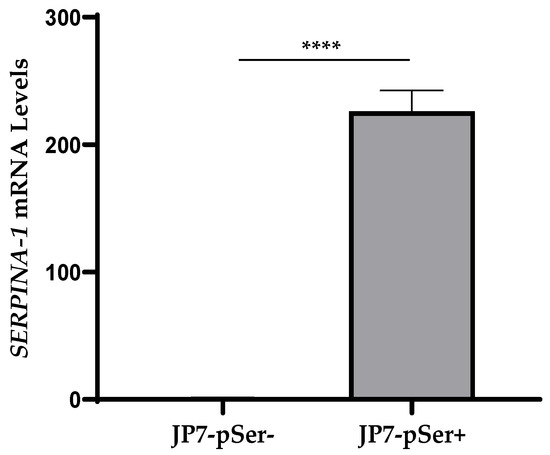 Relative expression of the SERPINA-1 gene in JP7pSer- and JP7pSer+ cells referred to the expression of Beta-actin housekeeping gene. Data are mean ± SD of at least three independent experiments, and significant differences between the two cell lines were shown as **** p-value < 0.0001.