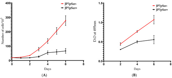 (A) The proliferation of 20 × 103 cells/well of JP7pSer+ or JP7pSer- evaluated by the colorimetric Trypan blue method. (B) The proliferation of 5 × 103 cells/well of the two cell lines, measured by enzymatic method (MTT). O.D: Optical density. Data are mean ± SD of at least three independent experiments and significant differences between the two cell lines, with p < 0.05 for both experiments.