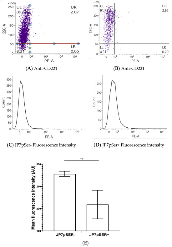 Cytofluorimetric analysis using anti-CD221-PE showed a near-absence of labelling in JP7 cells. The JP7pSer- and JP7pSer+ cell lines showed low and nearly similar percentages with JP7pSer- (3.9%) vs. JP7pSer+ (3.46%), t-test = 1.2 with a p-value = 0.22 > 0.05, not significant. The average fluorescence intensity over three measurements for each cell line shows that JP7pSer- cells have an average MFI = 278.33 AU, while for JP7pSer+, the average MFI = 209.33 AU, with different confidence intervals CI99: [272.48; 284.17] for JP7pSer- and CI99: [177.31; 241.34] for JP7pSer+. The p-value < 0.01 with a significance threshold of 0.05. These results indicate that CD221 expression is globally very low in both JP7pSer- and JP7pSer+ cell lines, but with a 25% decrease in JP7pSer+ compared to JP7pSer- (Figure 5E).