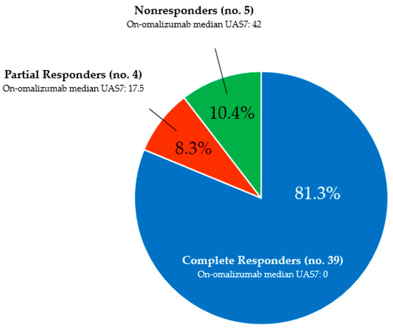 Of the 48 patients in the study population, 39 showed a complete response, 4 a partial response, and 5 no response at the initial assessment conducted at 16 weeks. Figure 1 summarizes the results along with the corresponding UAS7 scores.