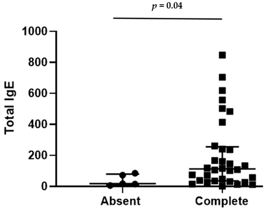 Scatterplot for individual total IgE values according to treatment outcome (absent response versus complete response).
