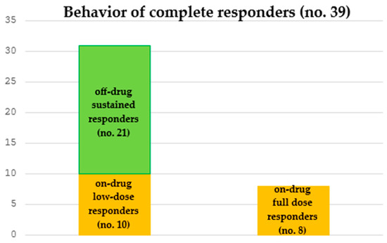 Complete responders could be further subdivided into those who achieved CU remission without the need for ongoing omalizumab injections (i.e., off-drug persistent remission), and those who maintained symptom control only with uninterrupted omalizumab administration (i.e., on-drug responders). Of the 39 complete responders, 21 (53.8%) who underwent dose reduction and progressive extension of dosing intervals were eventually able to discontinue omalizumab without experiencing a recurrence of urticaria during the subsequent six months. Conversely, ten complete responders receiving low-dose omalizumab could not be weaned off treatment without flare-ups. Figure 4 summarizes the treatment outcomes for complete responders. Unfortunately, none of the variables included in the statistical analysis were able to predict the likelihood of sustained remission in the absence of continued therapy.