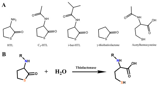 It is known that lactone-containing compounds play an important role in the regulation of various biological processes in living cells [1]. Therefore, they attract the attention of various researchers and developers of biologics used to solve urgent problems in medicine, veterinary science, sanitation, agricultural technology, and ecology. This applies in particular to thiolactones, which are heterocyclic compounds containing a sulfur atom in the lactone ring instead of oxygen. Recently, a potentially harmful metabolite of homocysteine, homocysteine thiolactone (HTL), and its derivatives (Figure 1A) have attracted the attention of scientists. Since HTL is formed as a result of reactions catalyzed by aminoacyl–tRNA synthetases in all cell types, its detoxification is necessary to maintain biological integrity [2]. Moreover, HTL and its derivatives were found among the peptides acting as regulators of quorum sensing (QS) mechanism in Gram–positive bacteria. QS is a communication process in the cells of different microorganisms, which ensures their unity and high stability to the influence of various environmental factors [2,3,4,5].