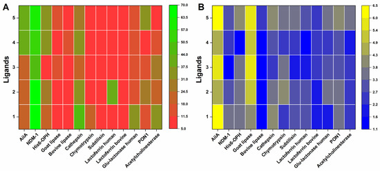 Relative area (%) occupied by the investigated ligands (1—HTL, 2—C2-HTL, 3—iBut-HTL, 4—γ-thiobutyrolactone, 5—Acetylhomocysteine) near the active sites (A) on the surface of certain enzyme and on total surface of the enzyme molecule (B). The value of the surface area of the active sites of enzyme (A) and the value of the area of the total surface of enzyme (B) were taken as 100%.