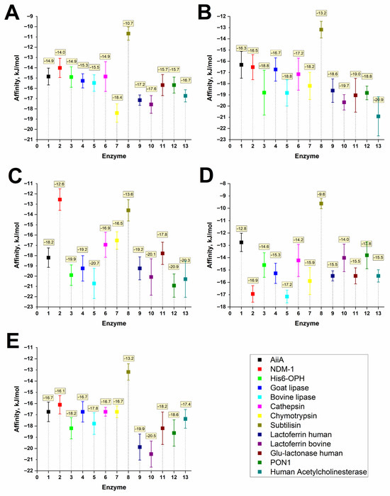 Mean value of affinity (kJ × mol−1) of investigated molecules (A)—HTL, (B)—C2-HTL, (C)—iBut-HTL, (D)—γ-thiobutyrolactone, (E)—Acetylhomocysteine to the surface of enzymes with hydrolase activity.